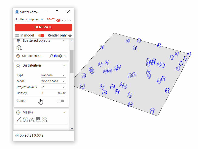 不像均匀分布,这种分布类型不会以均匀的方式散射实例,可能会出现一些团块,这可能取决于您的目标,也可能不可取。然而,随机分布的好处是计算速度明显加快。