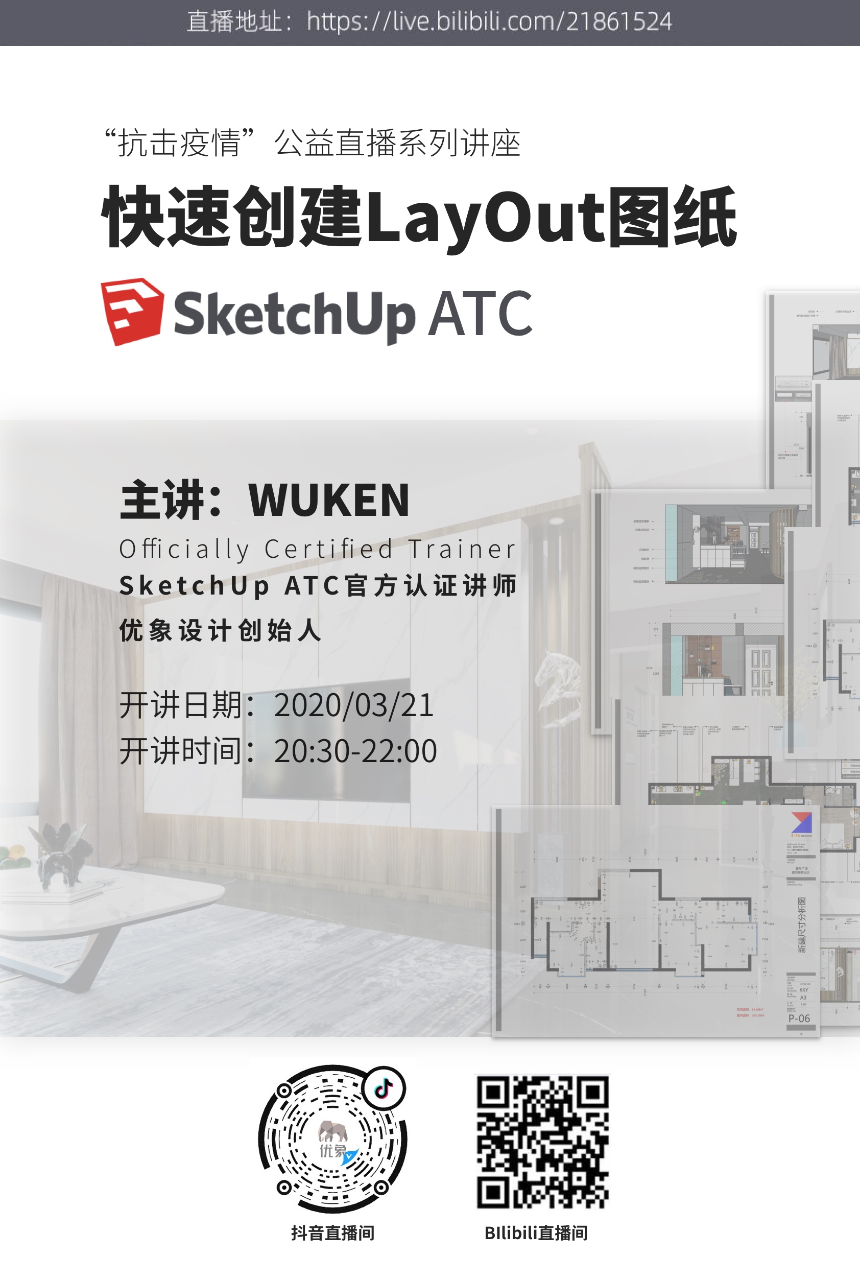 “抗击疫情”公益直播系列讲座:快速创建LayOut图纸 “抗击疫情”公益直播系列讲座 快速创建LayOut图纸 bilibili直播地址:https://live.bilibili.com/h5/21861524 抖音直播地址:搜索抖音号 yooox.net