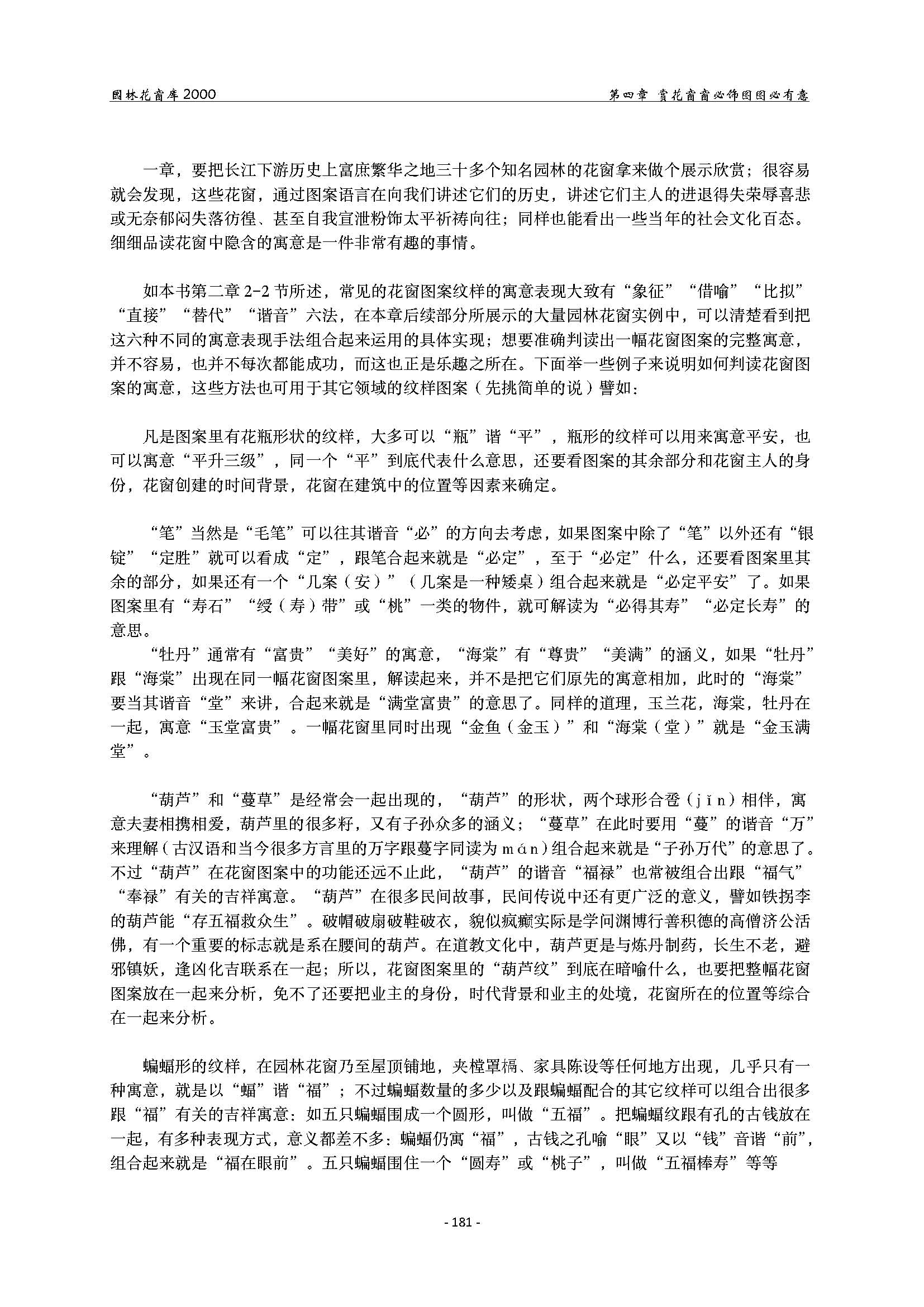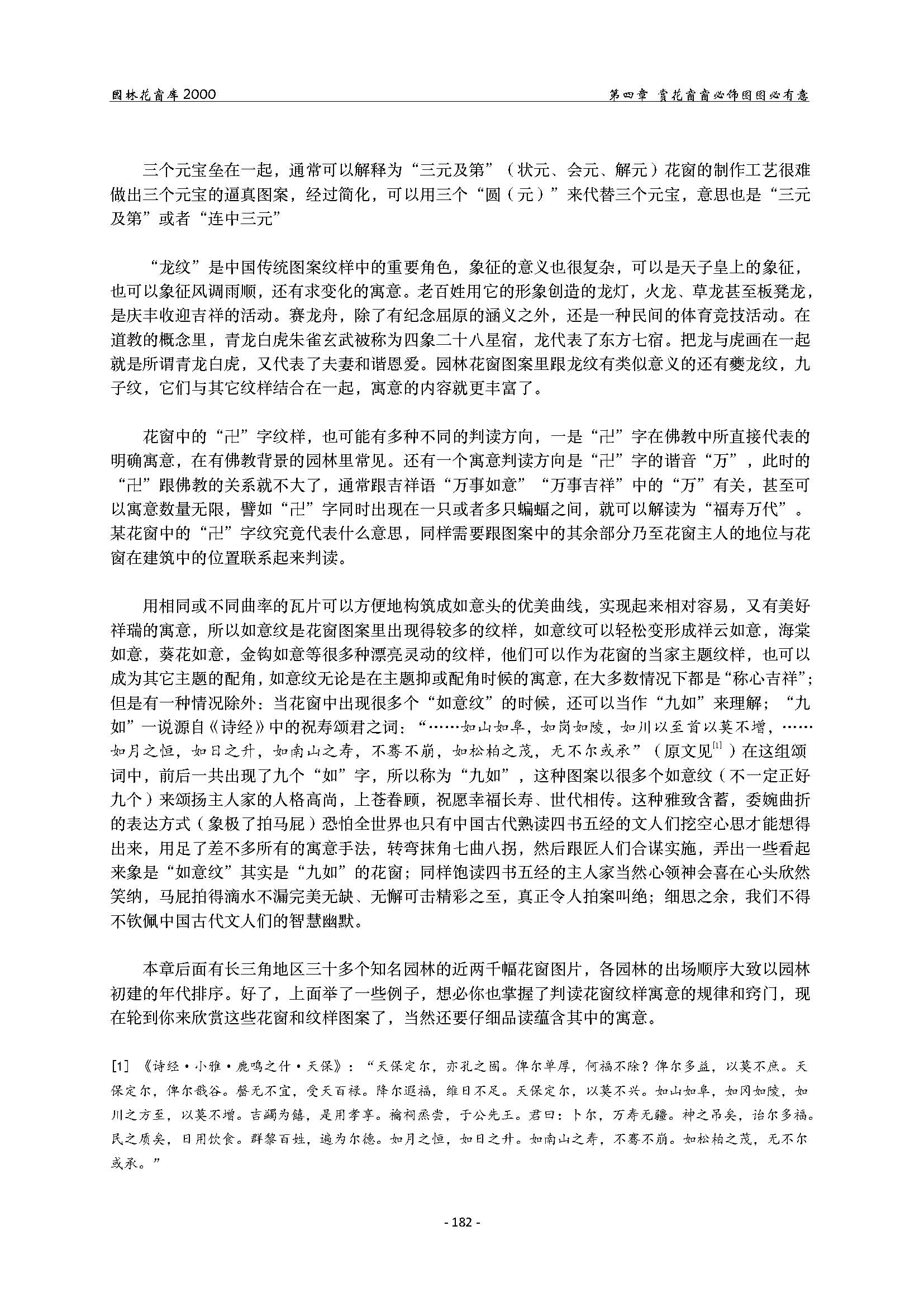 本书较详细地讨论了十多个不同类型的花窗,七十余种(连合并在一起的有120多种)园林花窗中常见的图案纹样与象征寓意。三十多个江南园林的近2000个花窗图样。