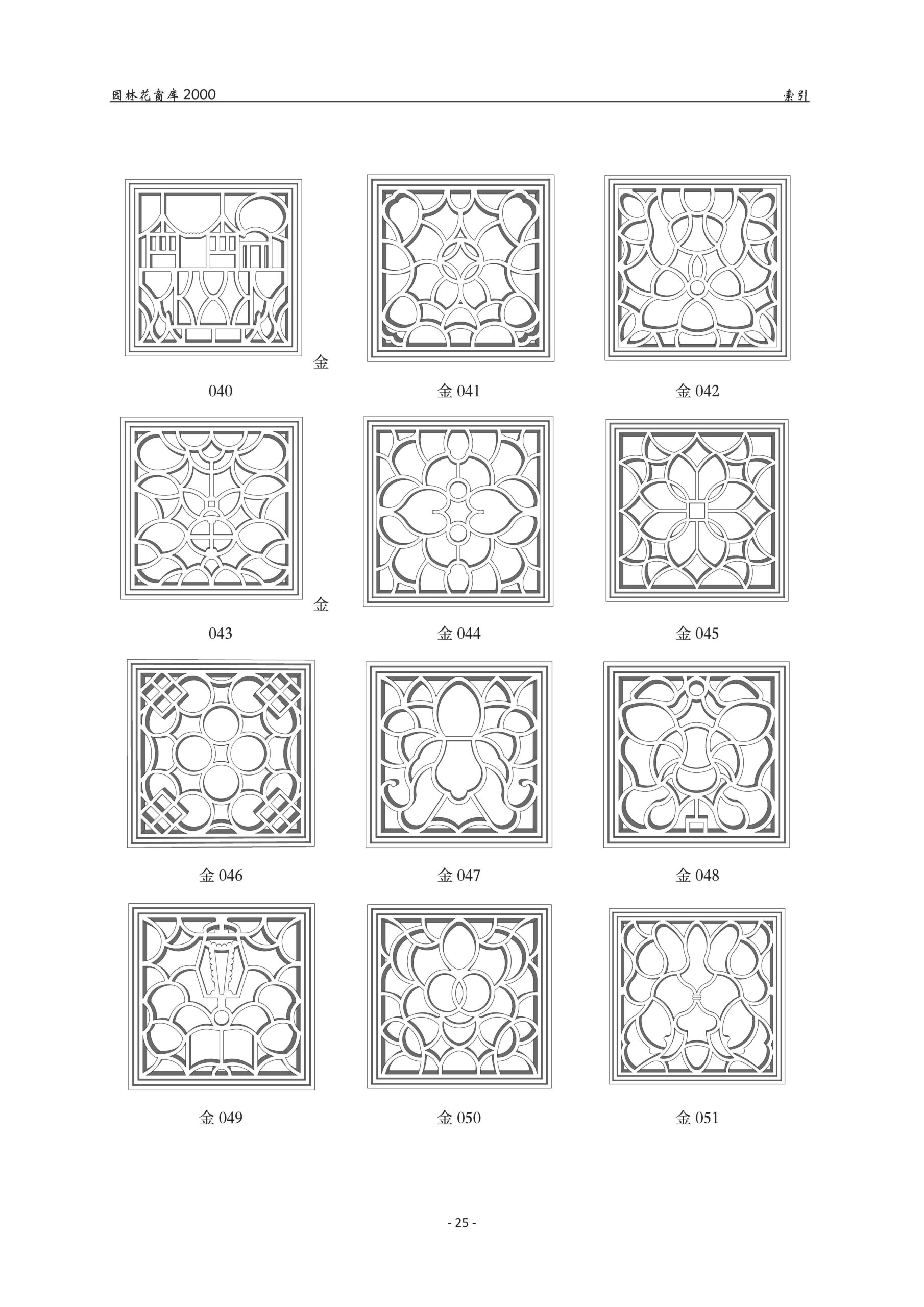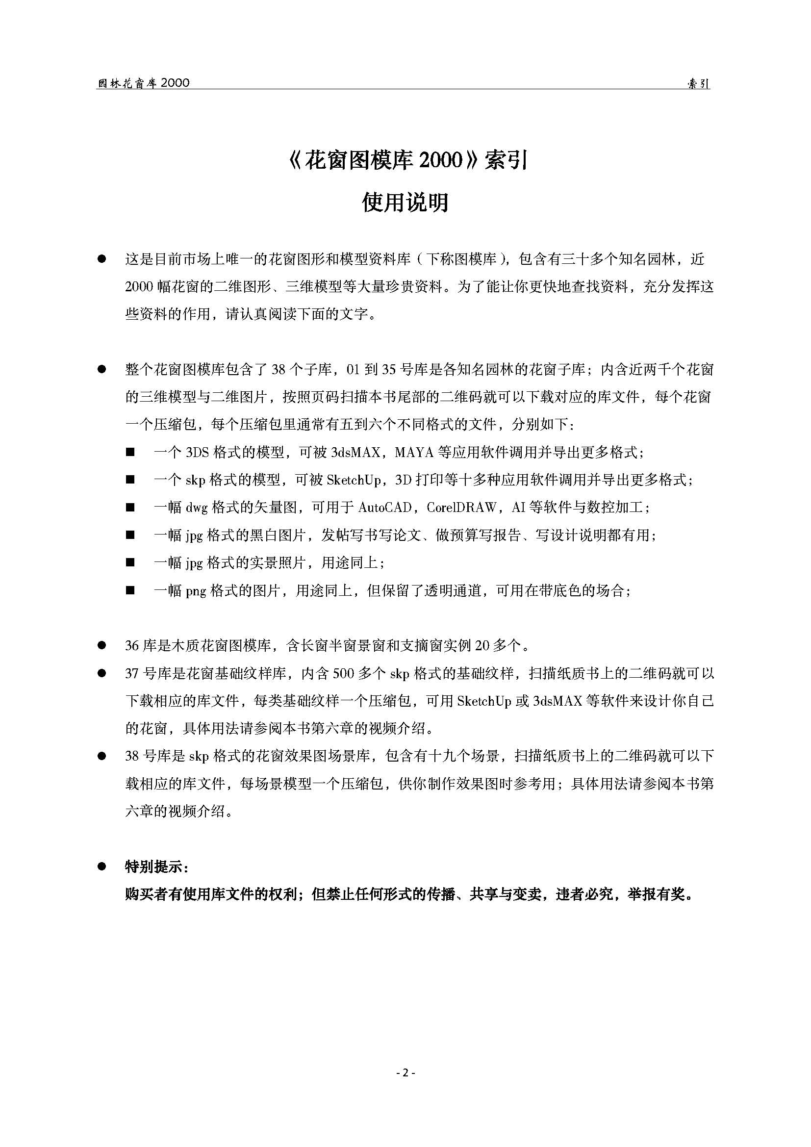 整个花窗图模库包含了38个子库,01到35号库是各知名园林的花窗子库;内含近两千个花窗的三维模型与二维图片,按照页码扫描本书尾部的二维码就可以下载对应的库文件,每个花窗一个压缩包,每个压缩包里通常有五到六个不同格式的文件,分别如下: