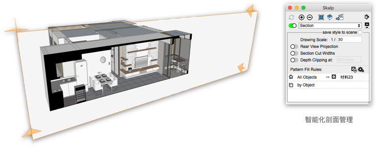 制作LayOut图纸需要大量的剖面,Skalpn内置智能的剖面工具,专注于创作,而不是繁琐的操作。