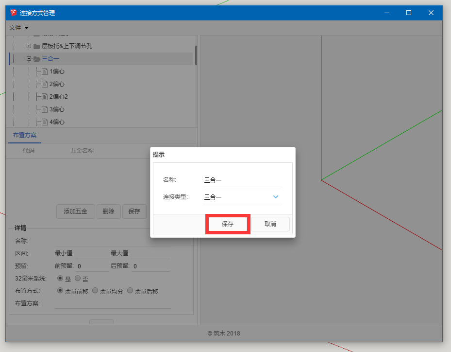 - 弹出对话框输入连接方式的名称【以三合一&木榫为例】,输入完成后,点击确定。