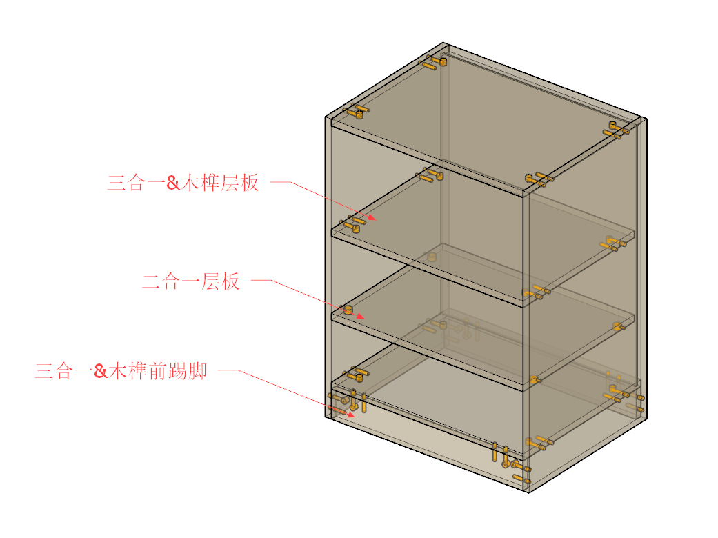 在入门教程三中,我们创建了五金连接件,当有了连接件以后,我们将以什么样的规则让这些连接件能够以不同的距离尺寸分布到板子上呢?如下图:板件之间用的五金数量以及连接方式是不一样的。而且每个公司都有自己的一套规则。为了满足这种多样化的需求,所以我们设计了连接方式的功能。