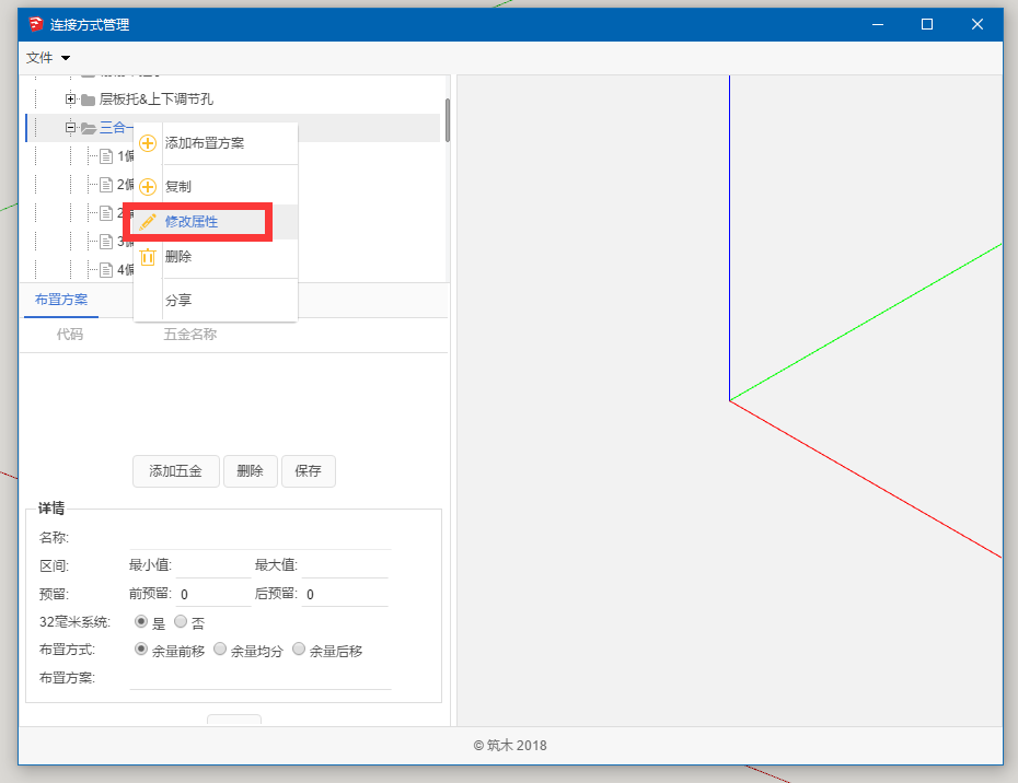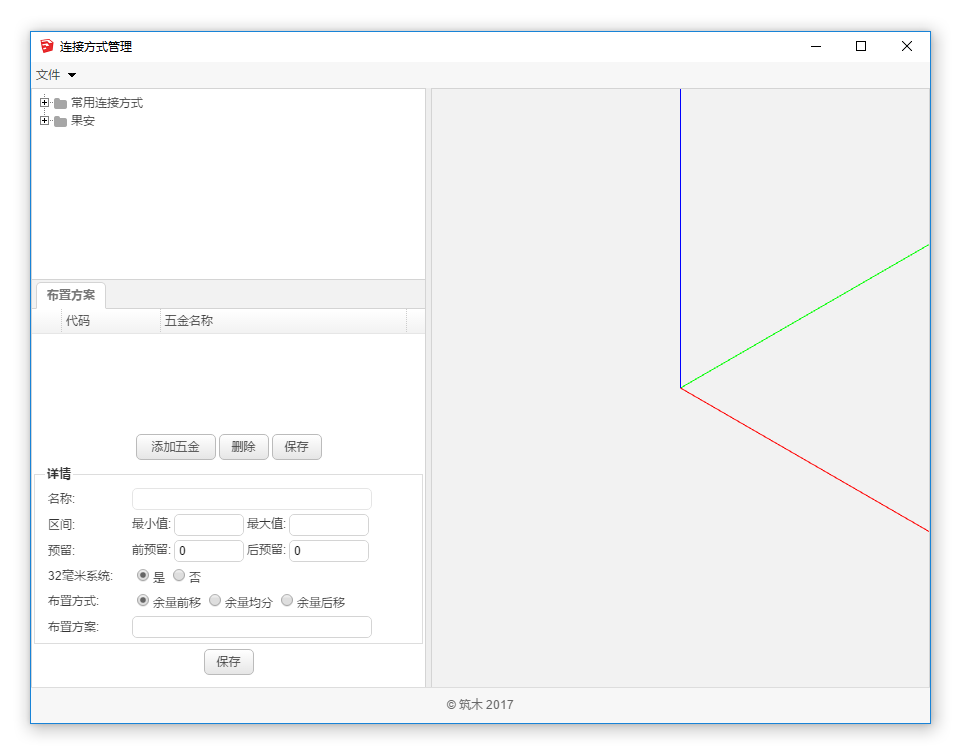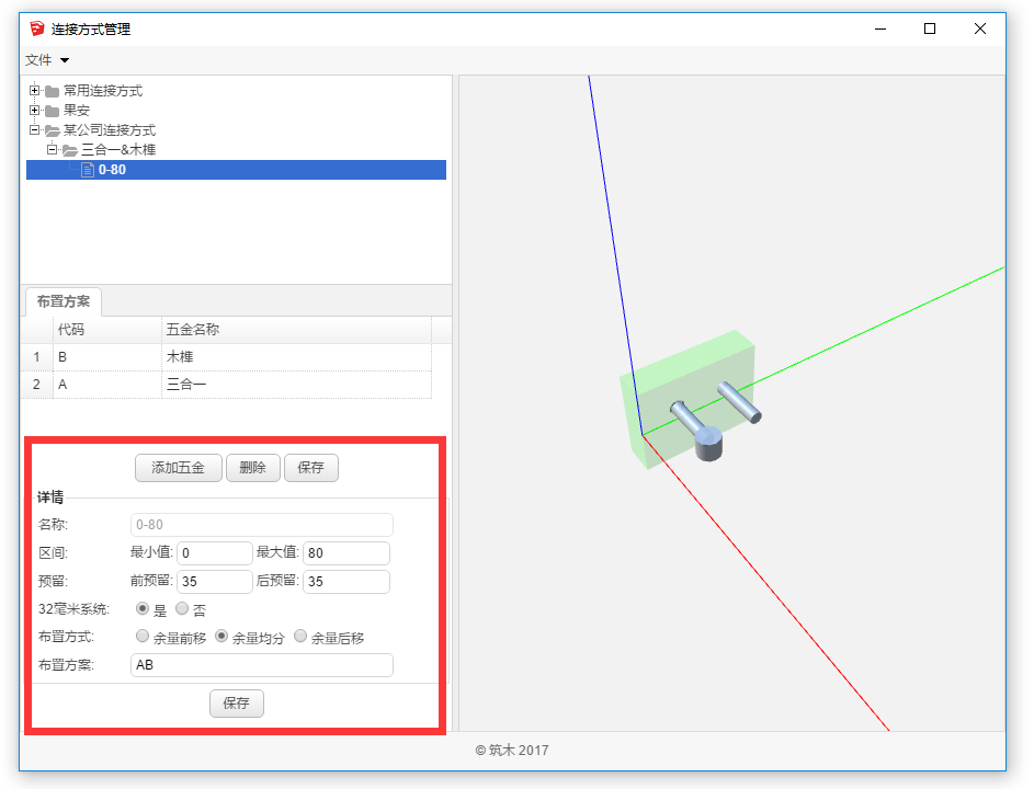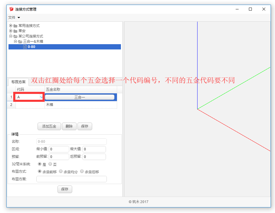 - 布置方案:根据五金的代码来写方案,如:AB则代表是:三合一和木榫,2个连接件之间的距离是32mm(孔距)。如过是A*B,则代表2个五金之间的尺寸为自适应尺寸。