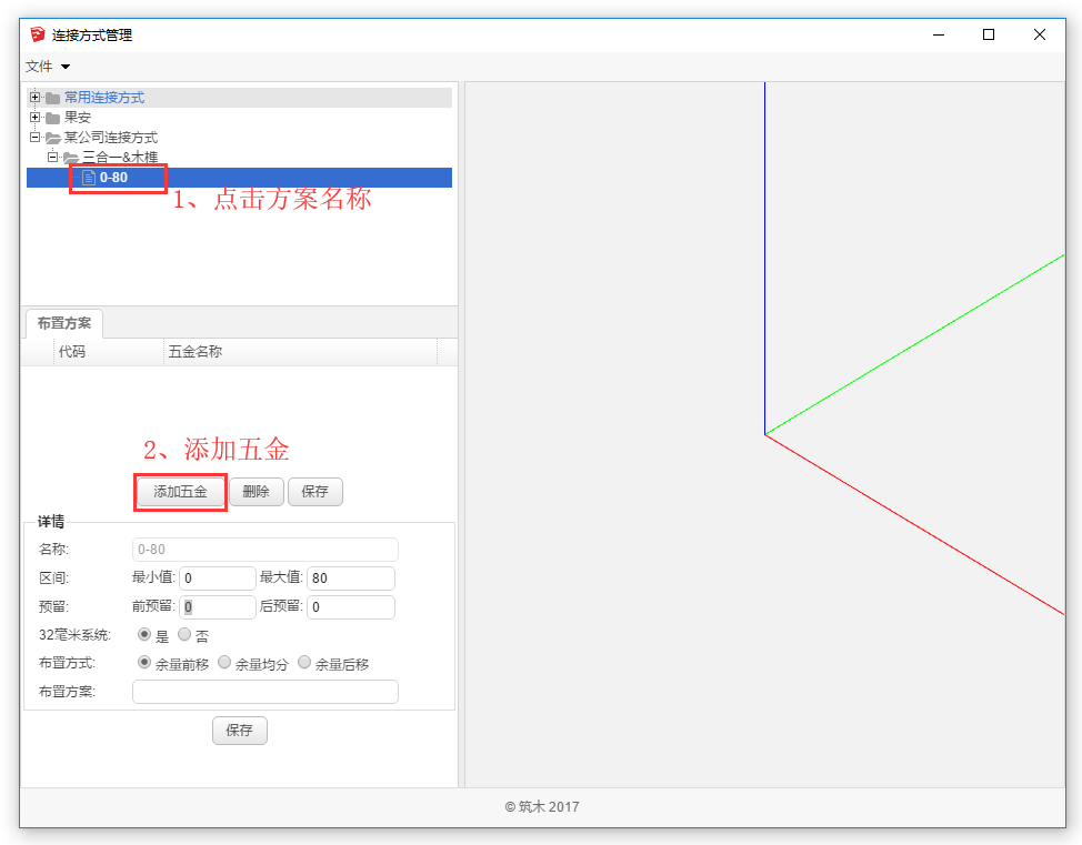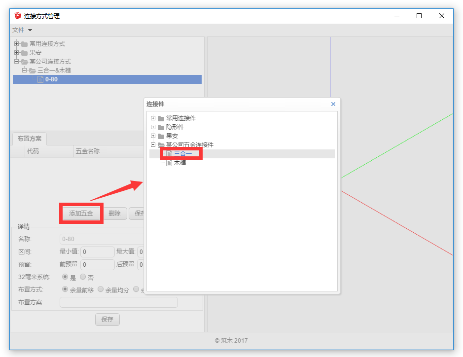 - 选择五金,根据上图提示,分别添加三合一和木榫到当前方案里