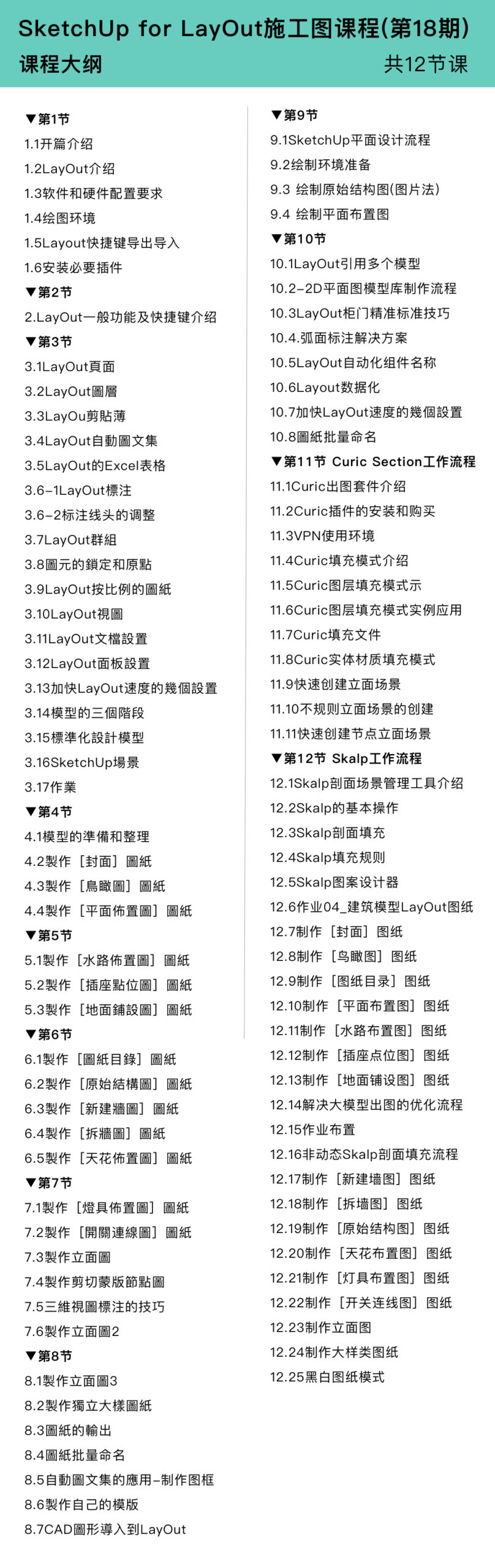 传统流程中,设计机构往往把做好的方案委托第三方进行CAD施工图纸的输出,最后导致的结果不但双方在沟通上花费了大量的时间成本,并且修改速度和质量并不如意,CAD施工图出现的问题也不好提前发现,使用LayOut出图和SketchUp模型深化,无需CAD基础即可以快速上手绘制一套完整的三维施工图纸,让设计方案进一步得到更好的落地验证,提前规避施工问题,最后根据深化模型交付整套的三维施工图纸,整个过程全部使用一个模型作为标准进行对接,无缝衔接设计工作流程.