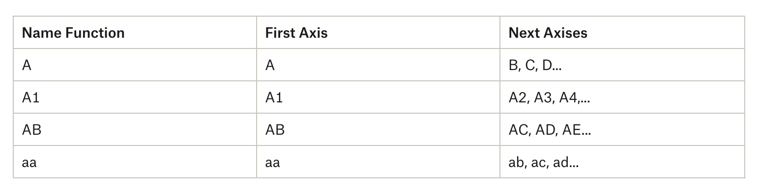 该工具将要求您输入网格的“名称功能”。这将添加到当前网格系统的第一个轴。其他轴将按字母规则命名。举些例子: