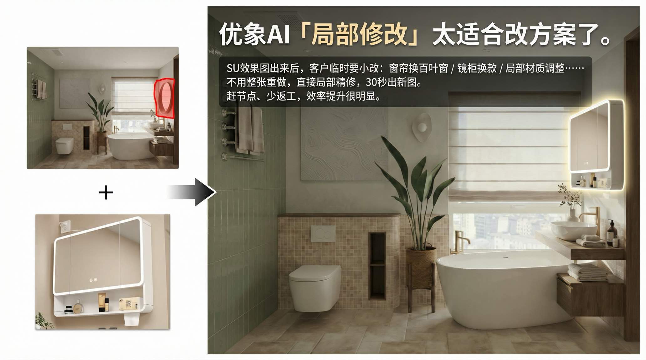 SU效果图定稿后,客户临时提出小改需求——软装替换、家具换款、局部材质调整……无需整张推翻重做,AI精准识别局部区域,30秒智能精修出新图。赶节点不慌,少返工不烦,改图效率肉眼可见提升。