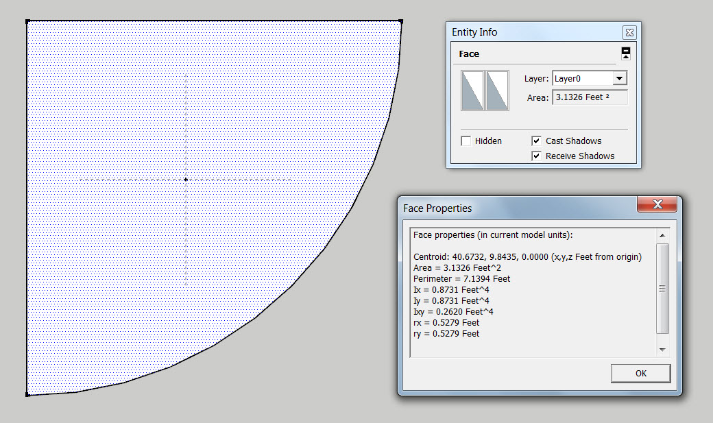 下面的形状是一个四分之一的圆,半径为 2 英尺,弧形由 12 段组成。如果边界是完美的弧形,那么面积应该是 Pi(3.1416 等)ft^2,但 SketchUp 和这个插件计算它是 3.1326 ft^2。这是由于 SketchUp 将所有弯曲边缘近似为折线。