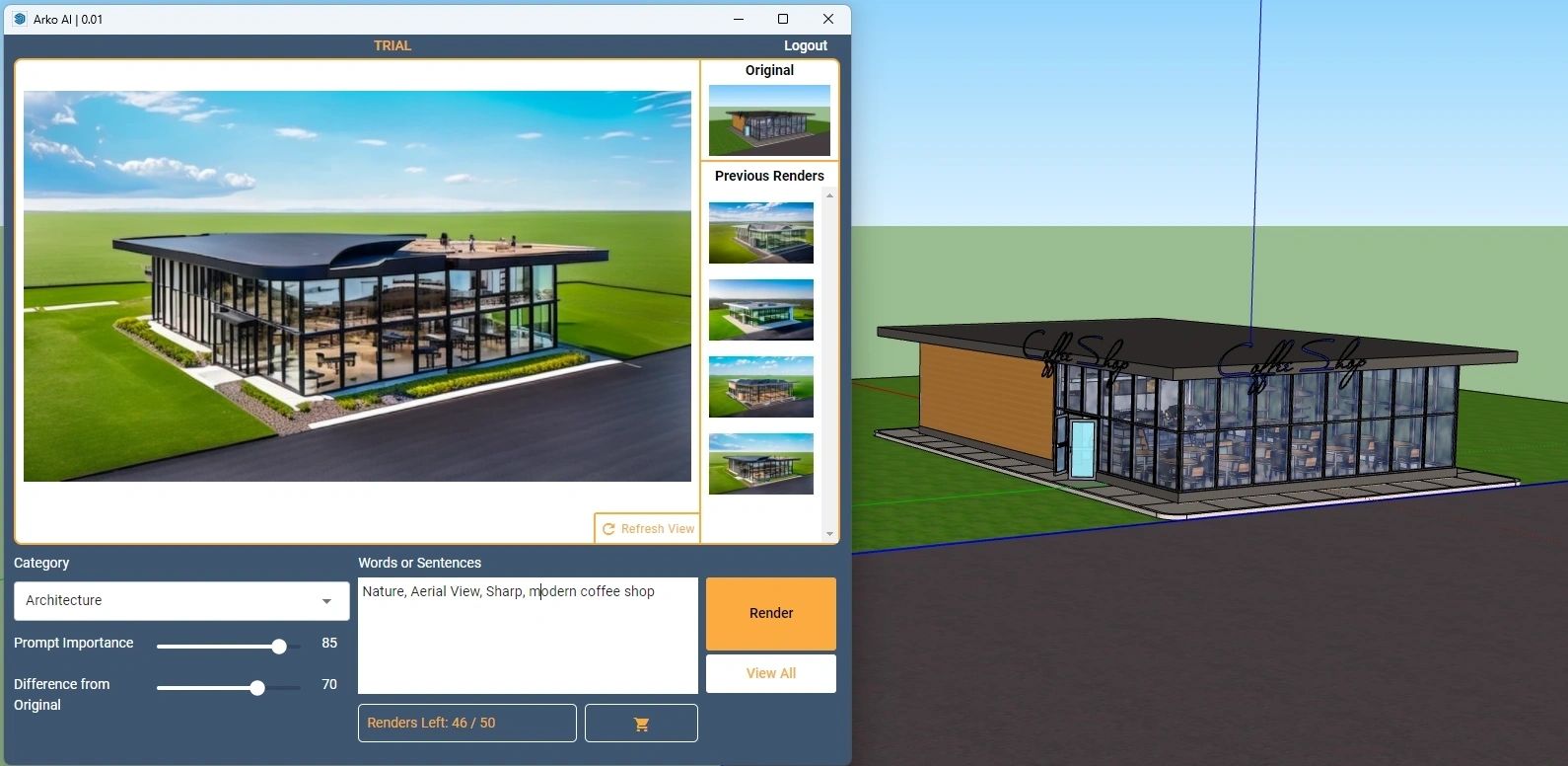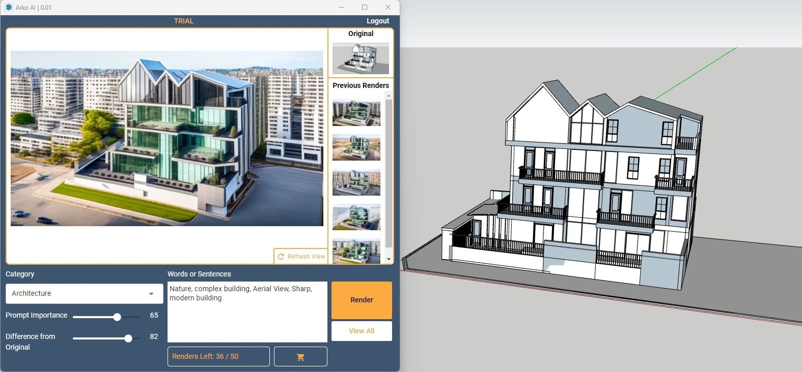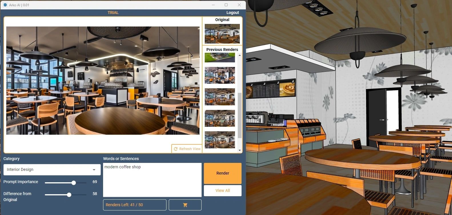 ArkoAI 使用人工智能 (AI) 使用您在 Revit®、SketchUp® 和 Rhino3D® 中的現有幾何體創建雲渲染。