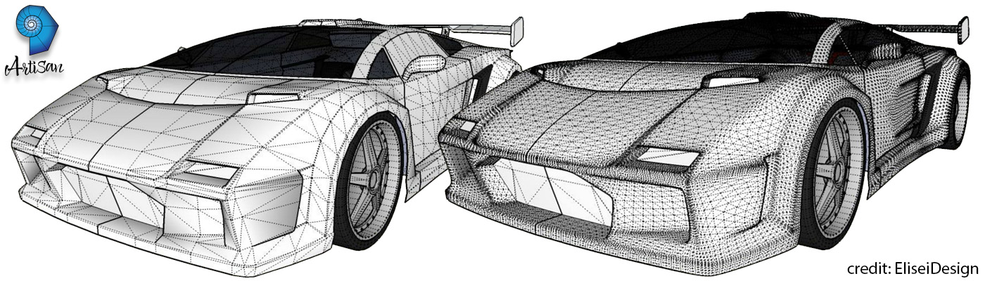 细分是一种3D 建模工作流程,其中编辑简化的粗糙低多边形网格以在平滑的高多边形网格上生成最终结果。高多边形网格是通过细分和细化(平滑)网格的每个多边形生成的,通常使用多次迭代。在Artisan 中,每个4 边形的多边形(四边形)被细分为另外4 个四边形。这种类型的细分称为Catmull-Clark 细分。