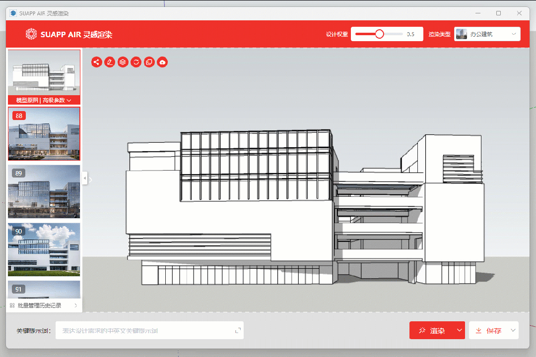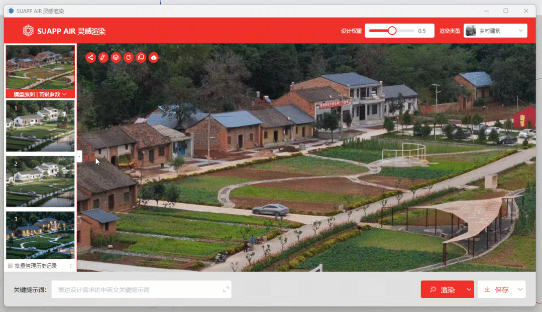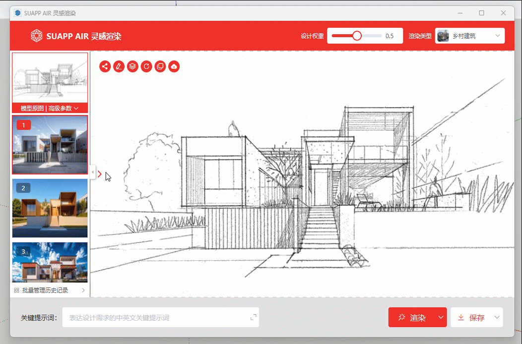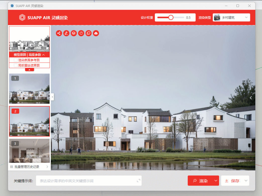 目前大部分的AI产品都是在主推“文生图”,也就是通过“文字描述”让AI生成一些设计图。SUAPP灵感渲染主推的是根据体块模型,或者不是很完善的方案图纸让AI去再次发挥并细化找灵感方案。
