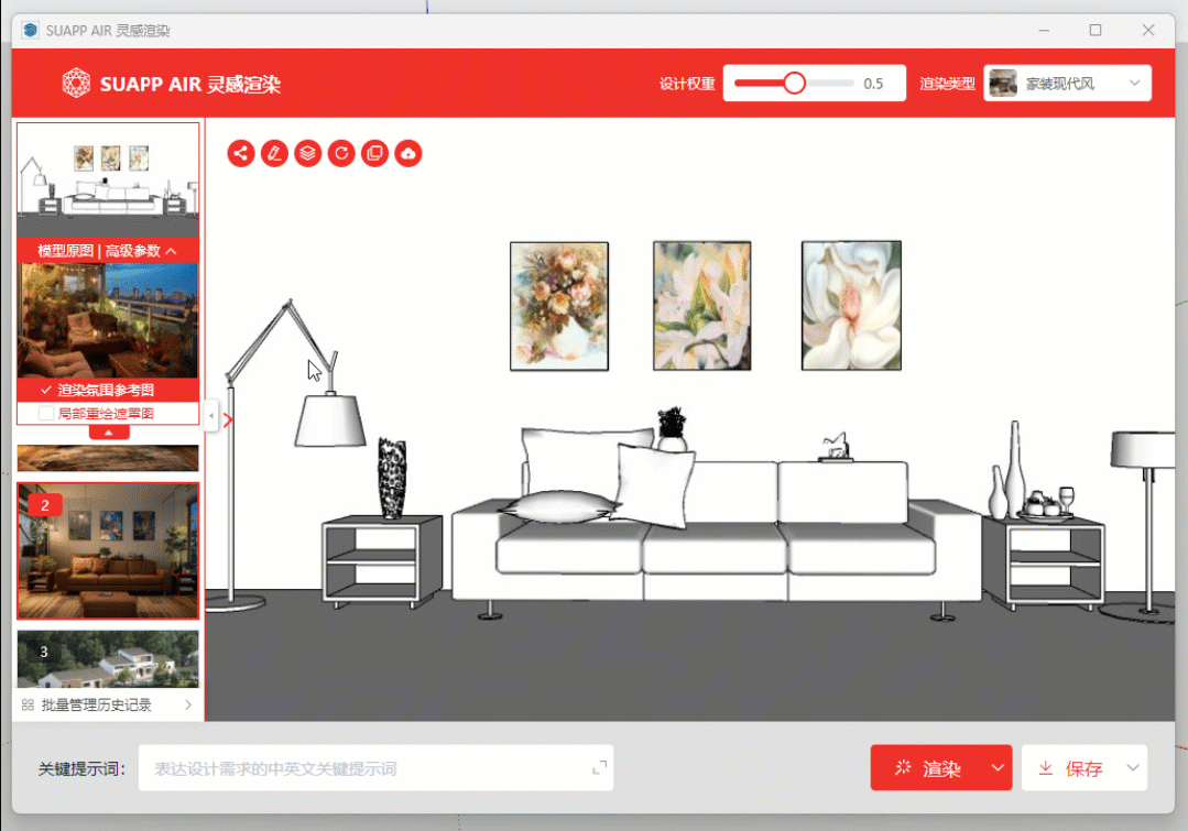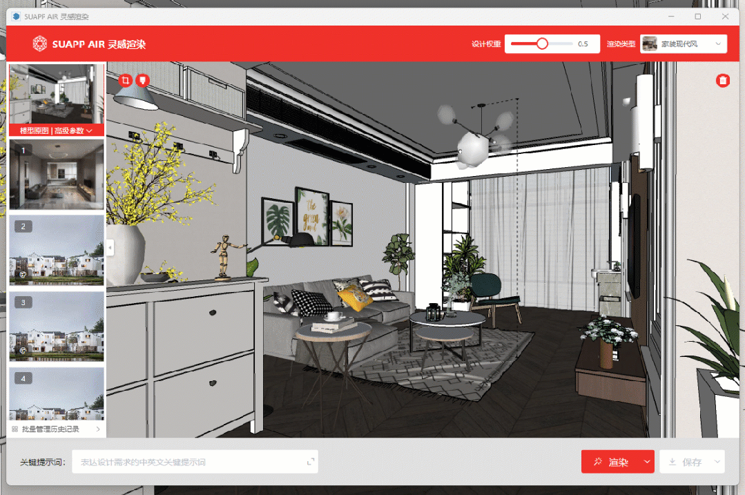 SUAPP AIR “灵感渲染”,是SUAPP开发的一个AI绘图插件,内置于SUAPP插件库中使用。它并不是一个真正的渲染器,而是用于前期方案的设计工具。只需要简单调节参数,它可以给你灵感闪现一个“渲染图”,用以辅助推敲设计方案,提高前期方案阶段效率。