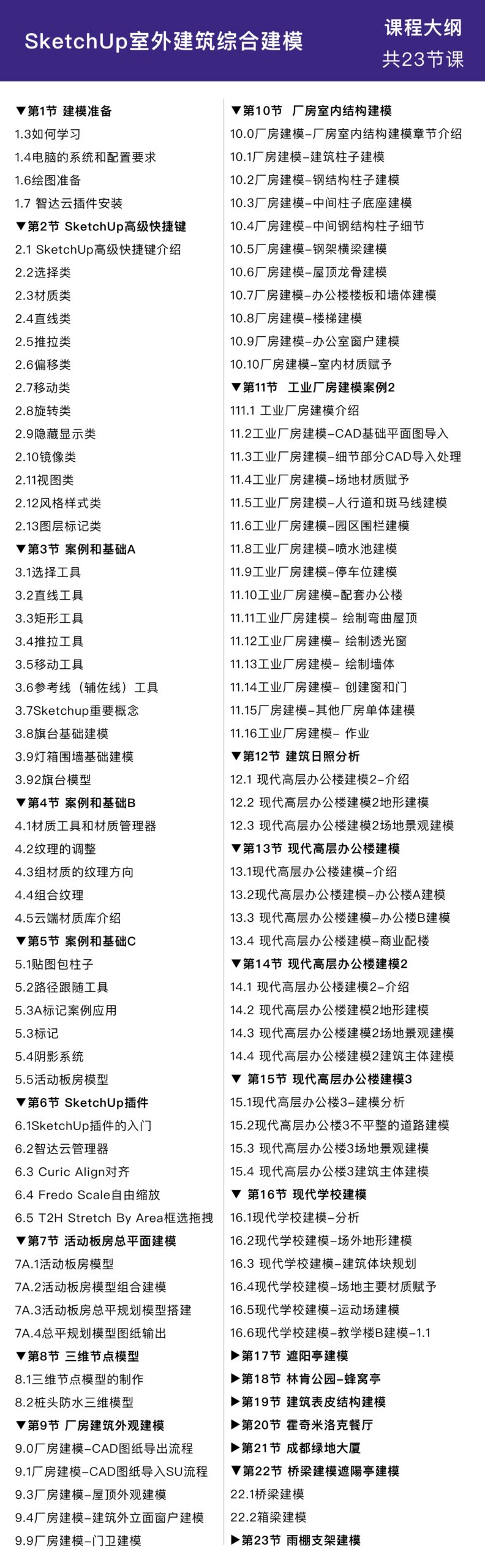 课程针对建筑室外有专门的案例练习,全方位照顾零基础入门的用户,从小白到高手快速掌握SketchUp的核心能力.