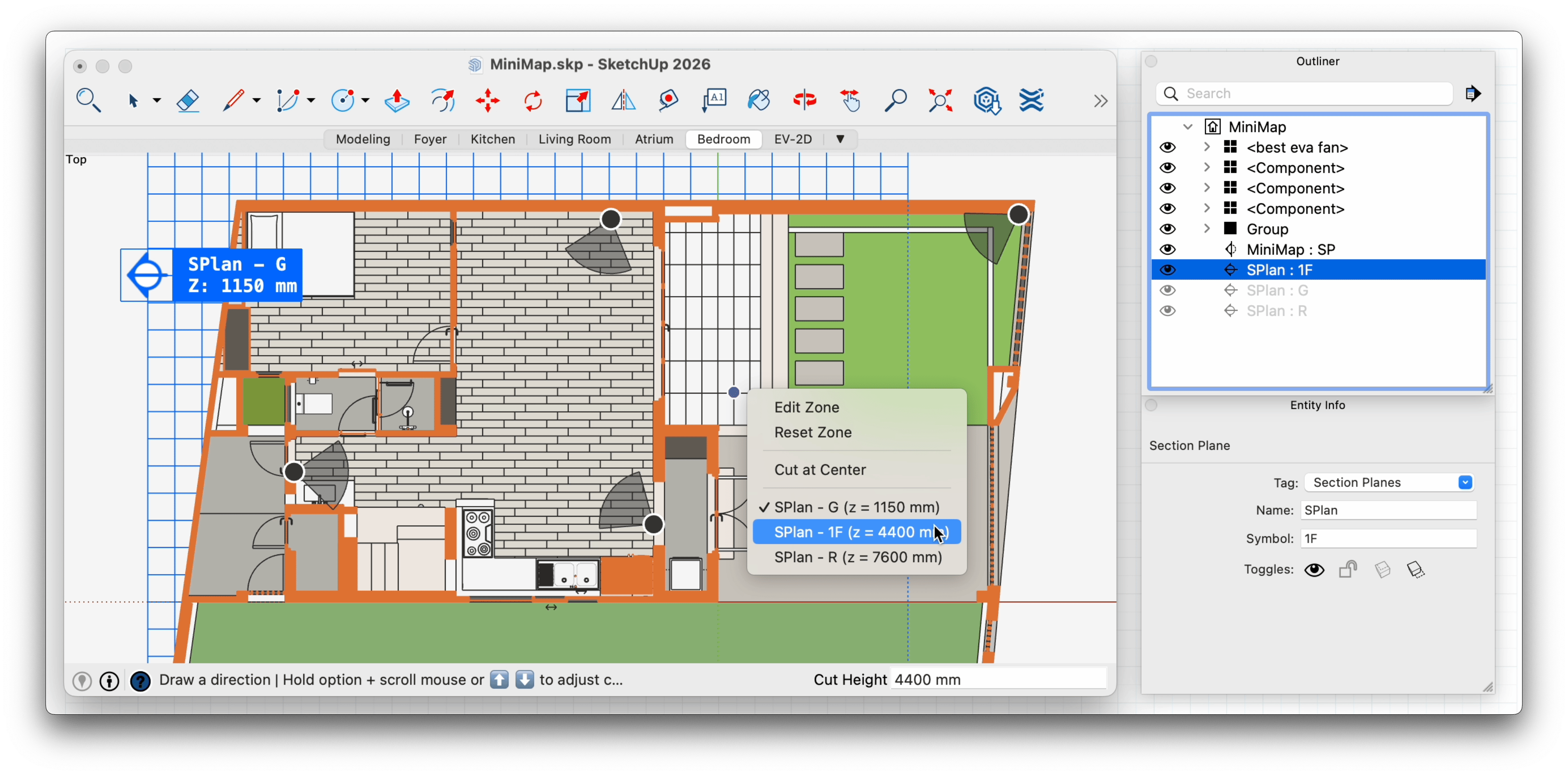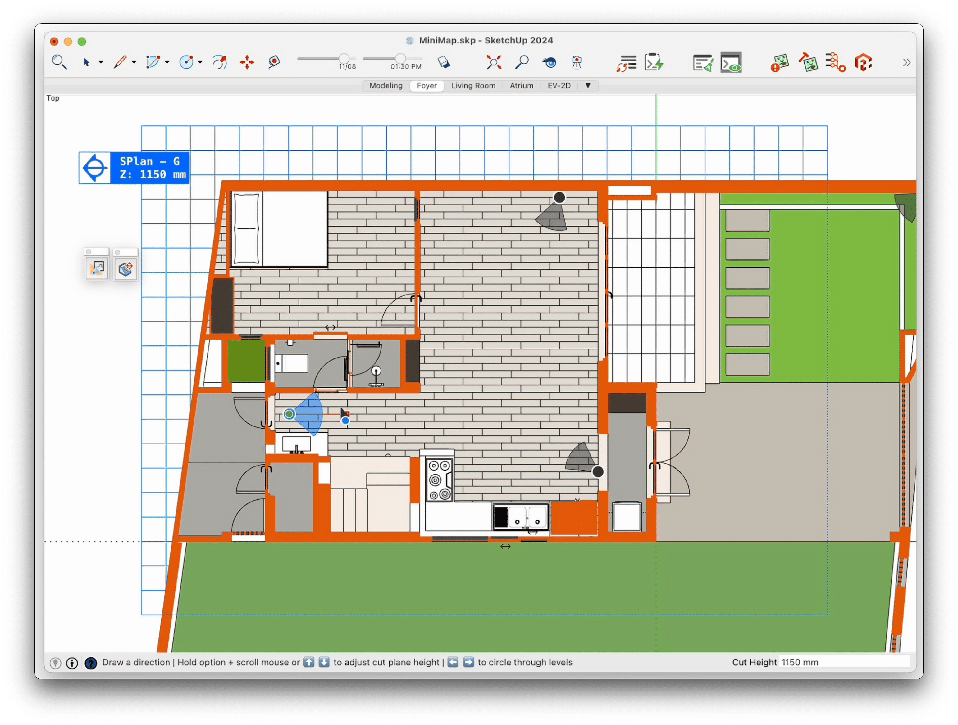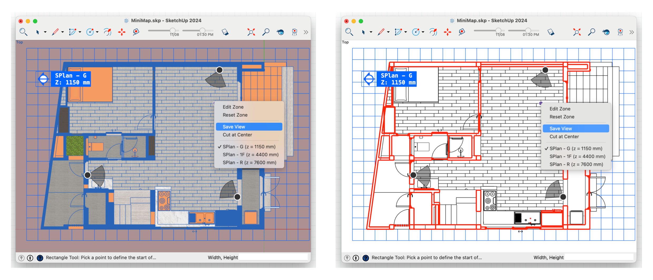 您的空间的平面图会立即显示出来,您可以对其进行拖动或选取以设定位置和观察方向,然后摄像机会直接移动到该位置。 虽然 SketchUp 不具备近裁剪或多视图支持功能,但 MiniMap 通过生成实时的二维剖面图来弥补了这一不足,使您能够直接从平面图中选择位置和方向——就像游戏中的小地图一样。 再也不用在狭窄的空间里费力地旋转寻找,也不再需要费力避开隐藏的障碍物了:在平面视图中只需点击一下,摄像机就能直接进入您想要的空间。 迷你地图覆盖层能让您在 SketchUp 软件中直接体验到一种全新的、类似游戏的多视图交互感受。