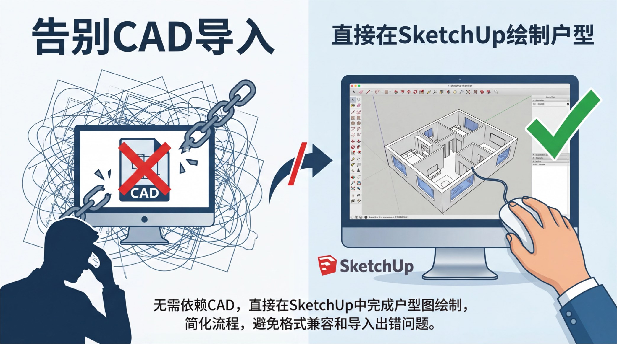 无需依赖CAD,直接在SketchUp中完成户型图绘制,简化流程,避免格式兼容和导入出错问题。