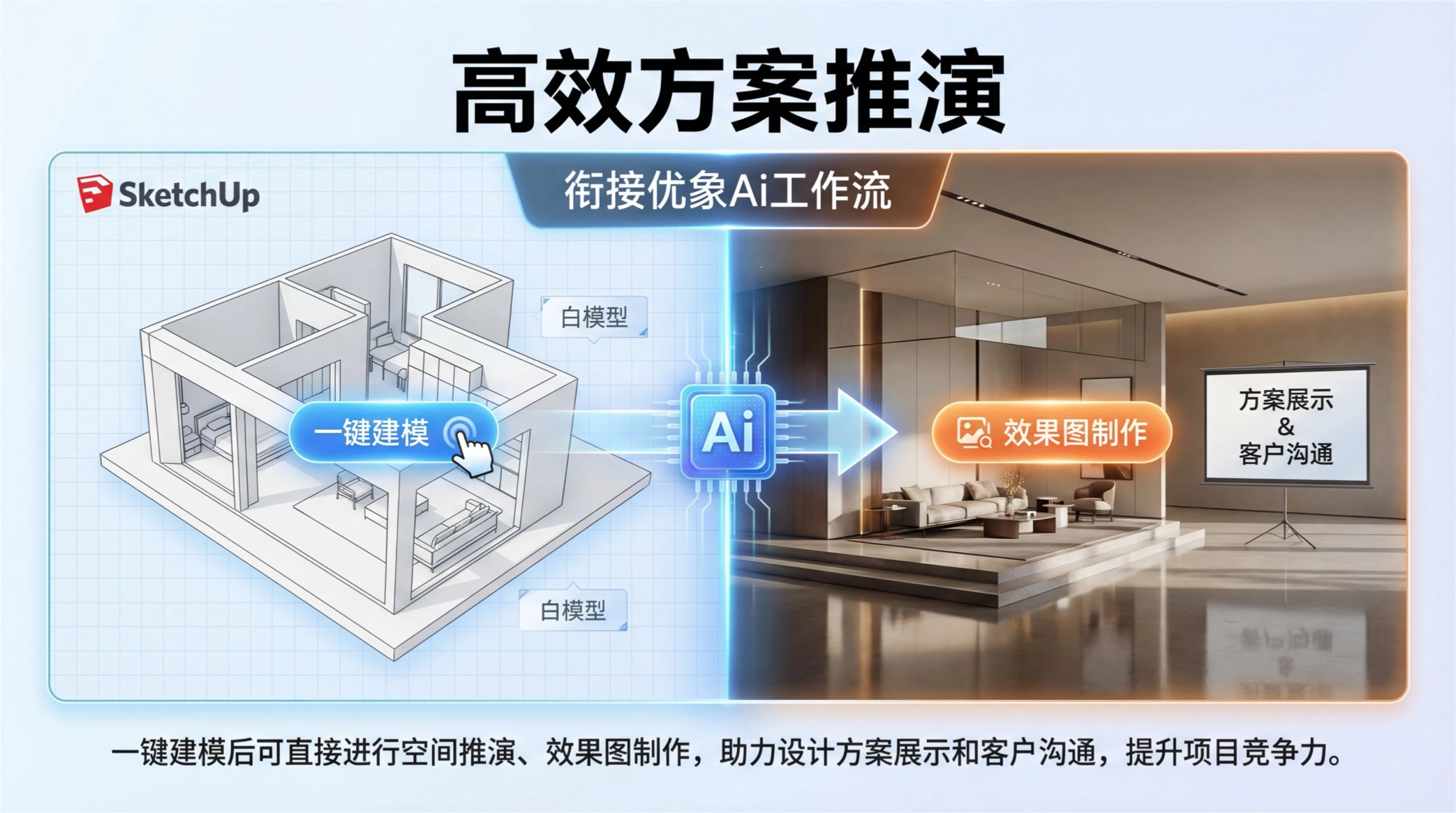 一键建模后可直接进行空间推演、效果图制作,助力设计方案展示和客户沟通,提升项目竞争力。