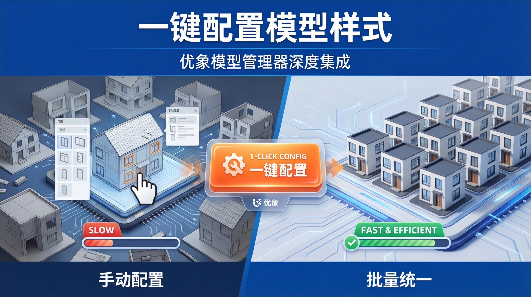 支持与优象模型管理器无缝结合,用户可一键配置户型模型的默认窗户、门等部件样式,实现批量定制,提升建模效率与统一性。