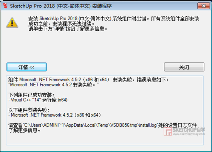 - 办法1:提示哪个系统组件安装不成功,那么我们就处理哪个系统组件。比如,如果提示是安装“Visual C++14运行库(x64)”出现的不成功问题,那就到控制面板或者软件管家,把所有Microsoft Visual C++2015或者2017 Redistributable的都卸载,就是Microsoft Visual C++2014以后的那几个卸载掉,再安装SketchUp就可以了。