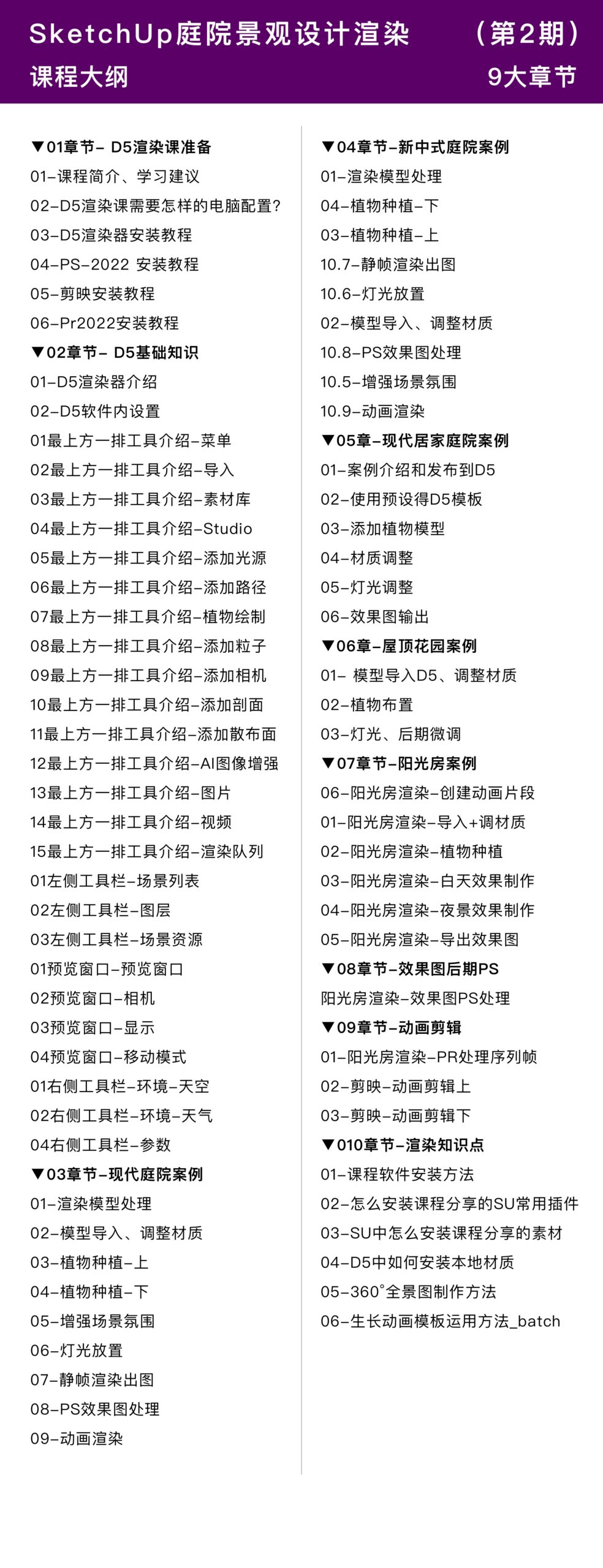 随着疫情期间的影响,全球经济的变化,大项目的存量变得越来越小了,大项目的运转也变得更加有难度,慢慢的庭院设计成了更加灵活和活跃的设计领域,有更强的可控性。如果你也想参与庭院设计,那么本课程将带你学习庭院设计的基本原理,通过不同风格案例演示,学习从CAD-SU-D5-PR的成熟工作流,让你学习从庭院方案→模型→效果图→动画(从小白出图到成熟输出作品,从室内设计延伸到庭院景观设计)的全流程。成为一个懂设计,会表现,能签单的设计师,